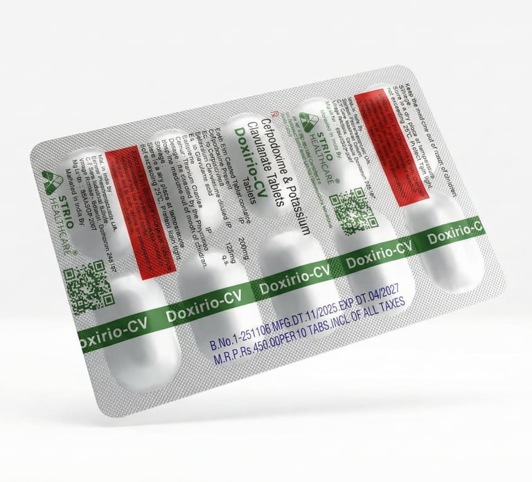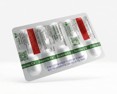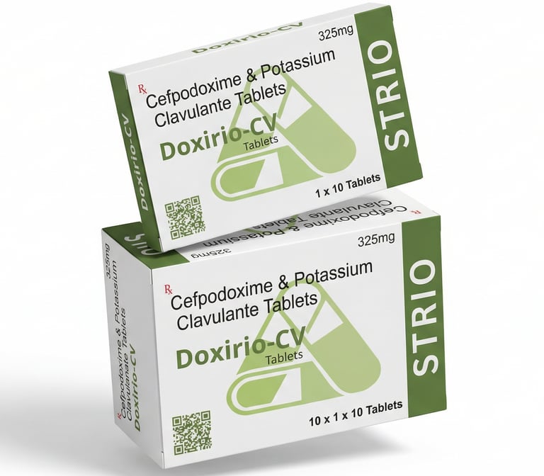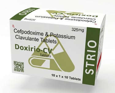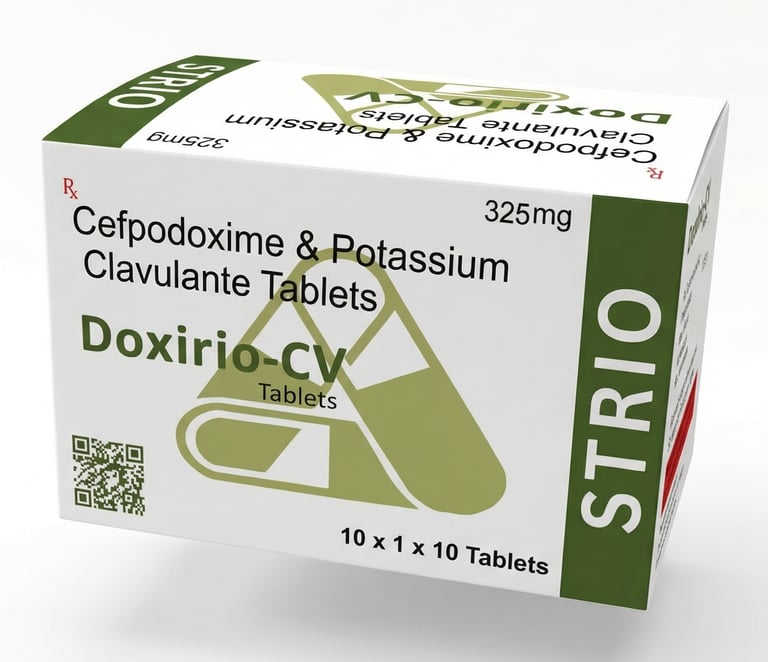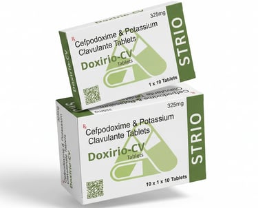 Doxirio-CV 325 is a broad-spectrum antibiotic combining Cefpodoxime Proxetil, a third-generation cephalosporin, with Potassium Clavulanate, a beta-lactamase inhibitor.