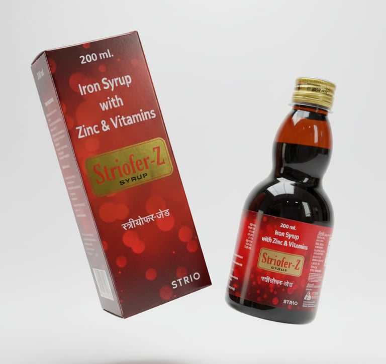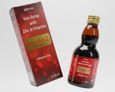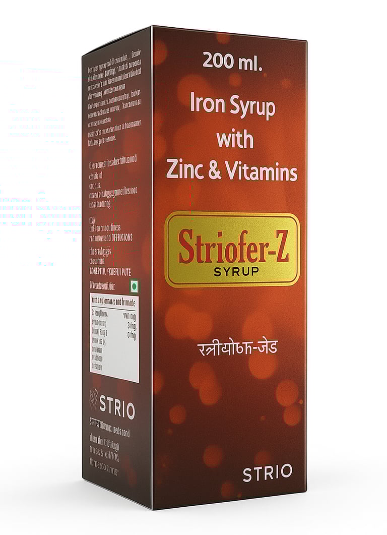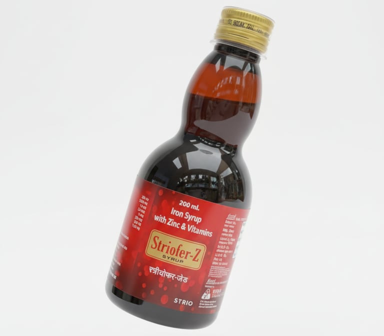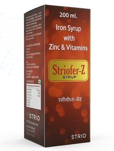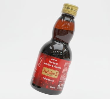 Striofer-Z is a comprehensive iron supplement syrup designed to combat iron deficiency anemia and support overall health. It combines Ferrous Gluconate with essential vitamins and minerals like Vitamin B6, Vitamin B12, Niacinamide, Folic Acid, and Zinc, all of which work synergistically to improve iron absorption, red blood cell production, and overall vitality.